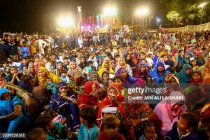 People attend a gathering during Navratri celebrations in Hyderabad, Pakistan, on October 5, 2025. The festival, dedicated to the worship of Goddess Durga, is marked by fasting, dancing, and devotional gatherings. (Photo by Jan Ali Laghari / Middle East Images via AFP) (Photo by JAN ALI LAGHARI/Middle East Images/AFP via Getty Images)