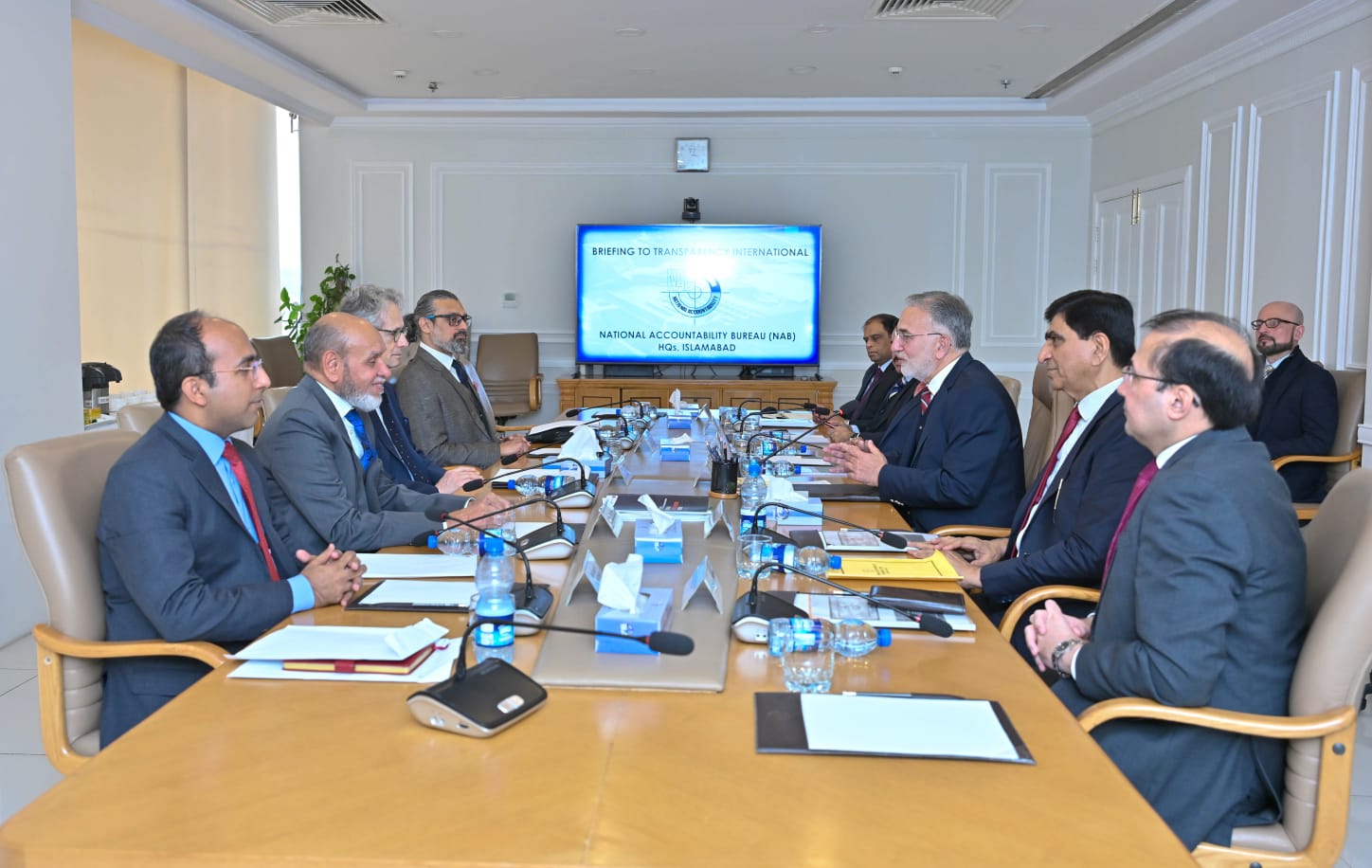 The TI delegation included Justice (R) Zia Perwez, Advocate Daniyal Muzaffar and Mr. Kashif Ali. Deputy Chairman NAB Mr. Sohail Nasir and senior NAB officers were also present.